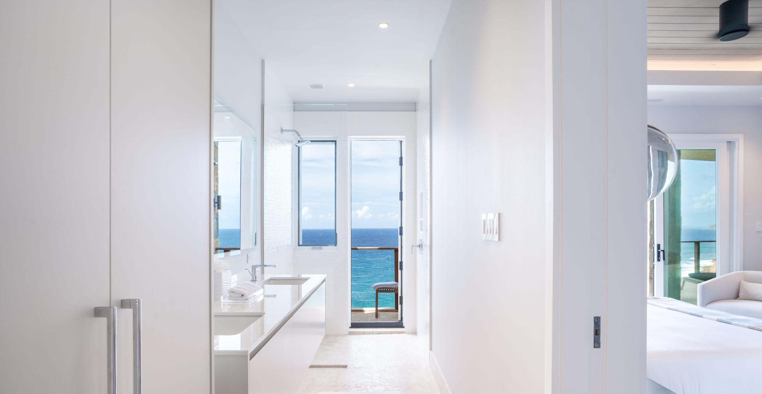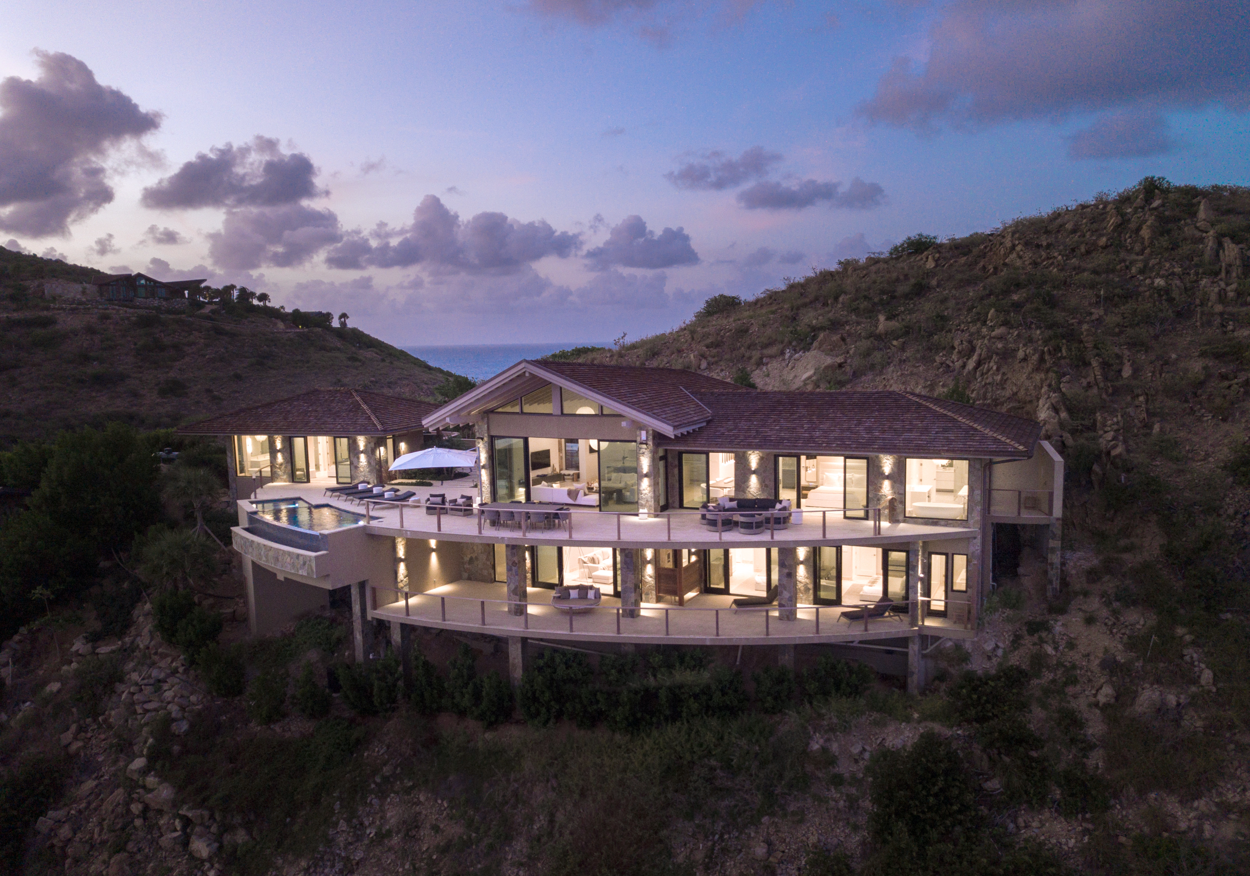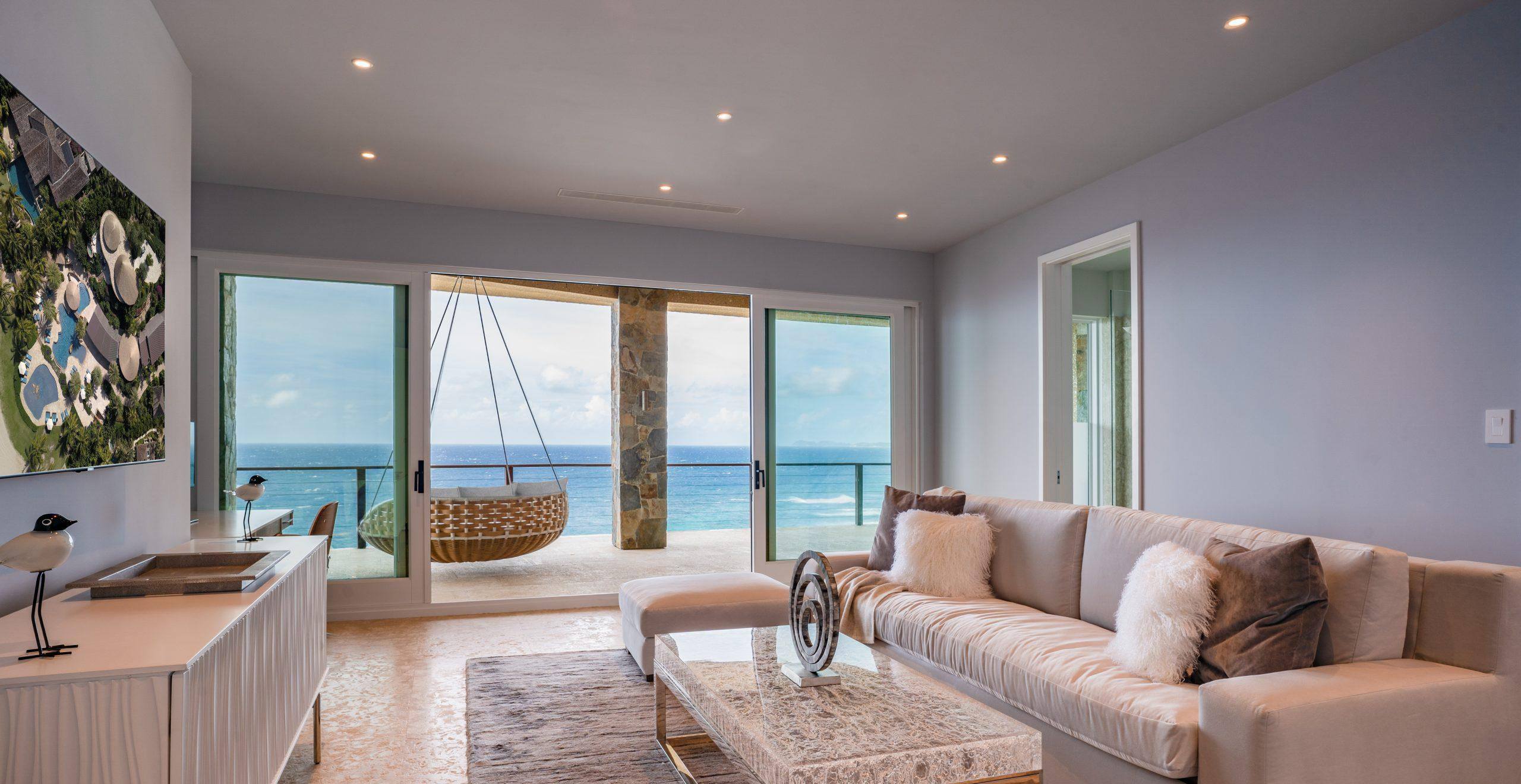 Hummingbird is a cliffside luxury residence overlooking the Caribbean Sea in the British Virgin Islands. Custom glass systems, including expansive sliding doors and panoramic windows, maximize ocean views while creating a seamless connection between interior living spaces and the surrounding terraces.